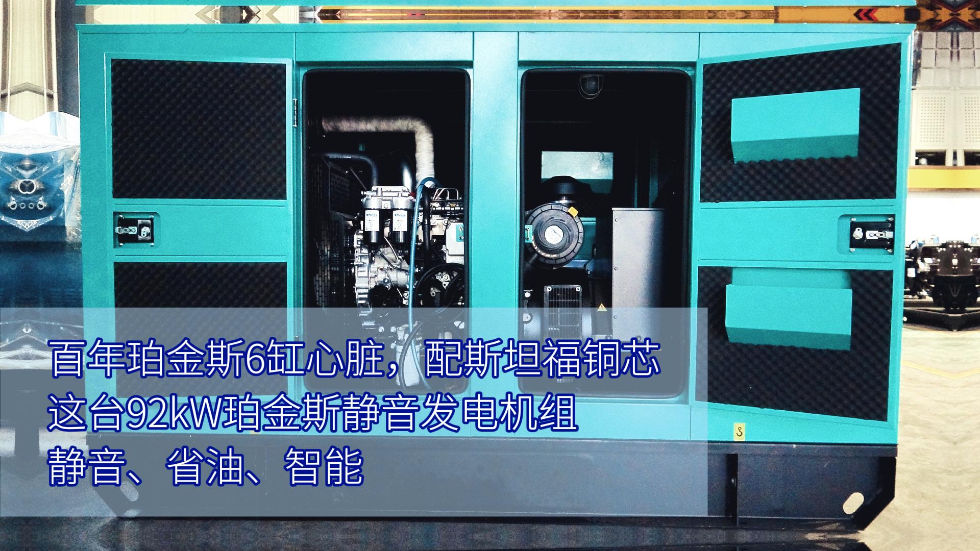- 百年珀金斯6缸心脏,配斯坦福铜芯,这台9 这款92kW珀金斯静音发电机组,选用珀金斯6缸发动机,四气门精准控流,不仅省油耐用,排放更达严苛环
